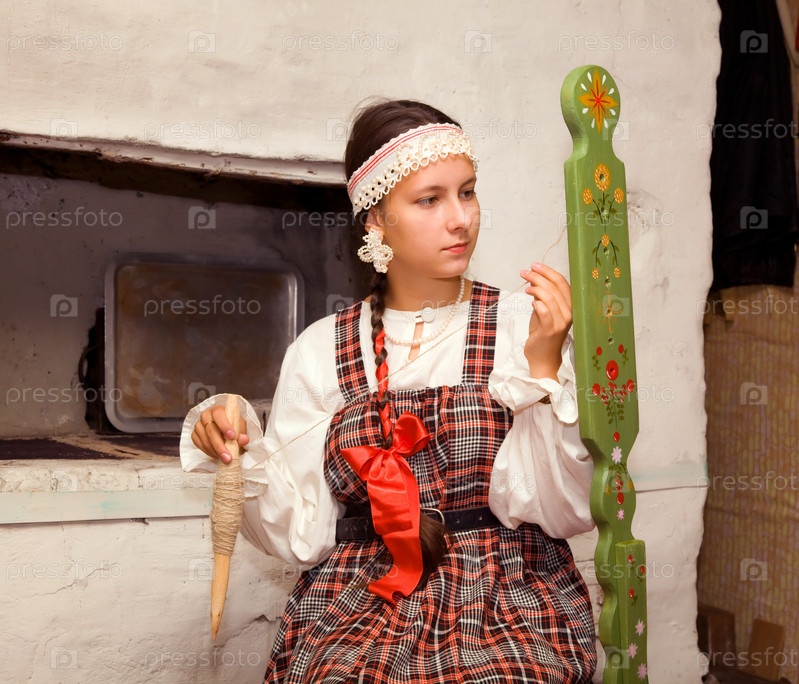 Девушка прядет шерсть