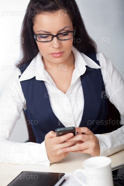 Деловая женщина смотрит на мобильный телефон