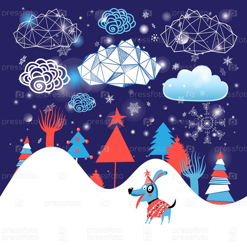 Рождественская открытка с собакой и елками