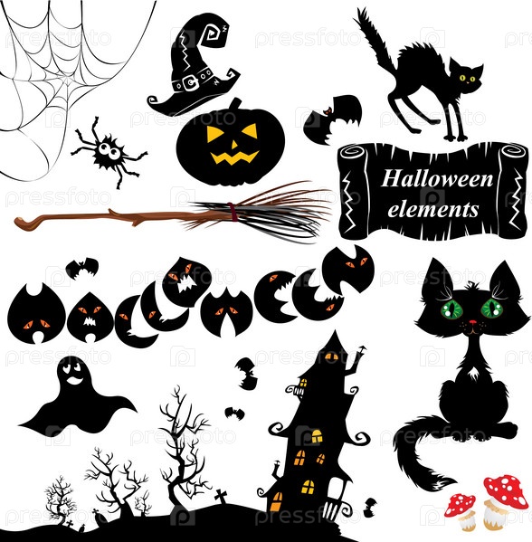 Набор элементов Хэллоуина. Тыквы, летучие мыши, призрак, кошка, таинственный дом и другие страшные вещи
