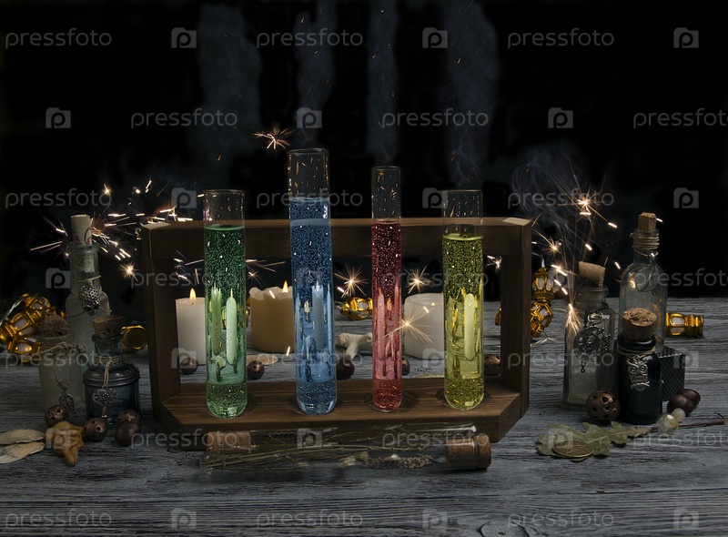 Магические ингредиенты на столе. Пробирки с красочными веществами