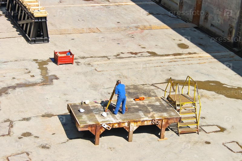 Инженер выполняет измерения в сухом доке верфи