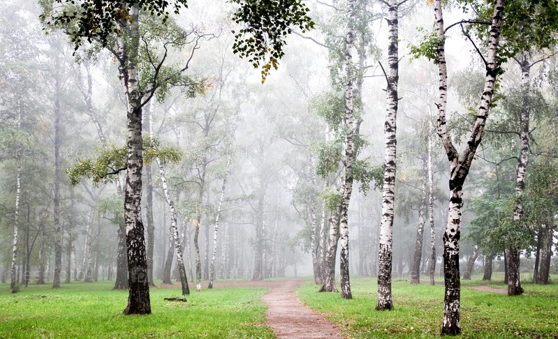 Утреняя березовая роща в осеннем тумане