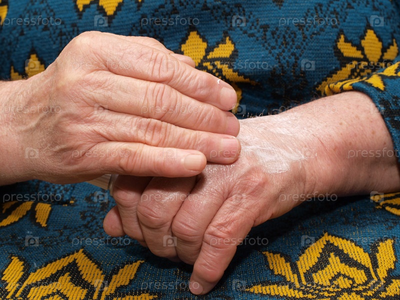 Пожилая женщина намазывает руки кремом