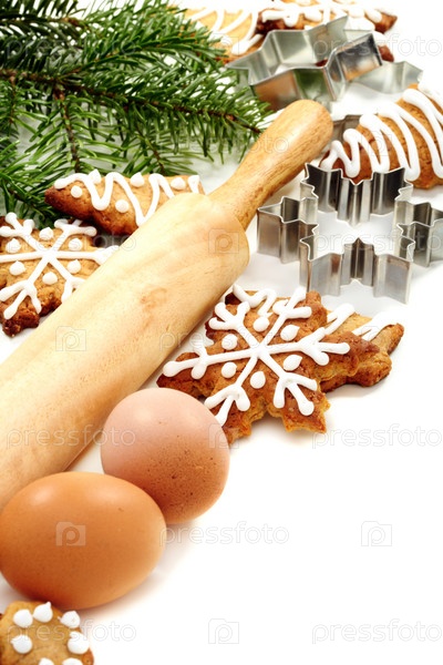 Рождественское имбирное печенье, яйца, скалка и формочки для теста