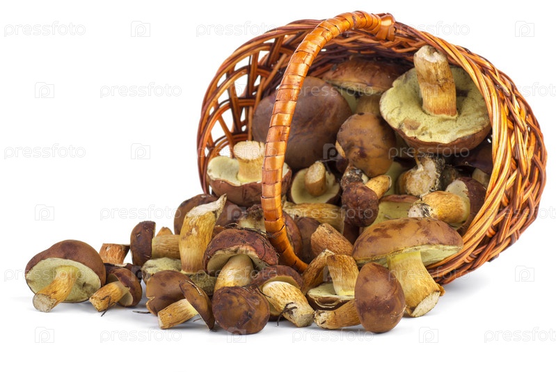Свежие польские грибы (коричневый гриб, панский гриб и моховик каштановый) высыпаются из корзинки. Белый фон