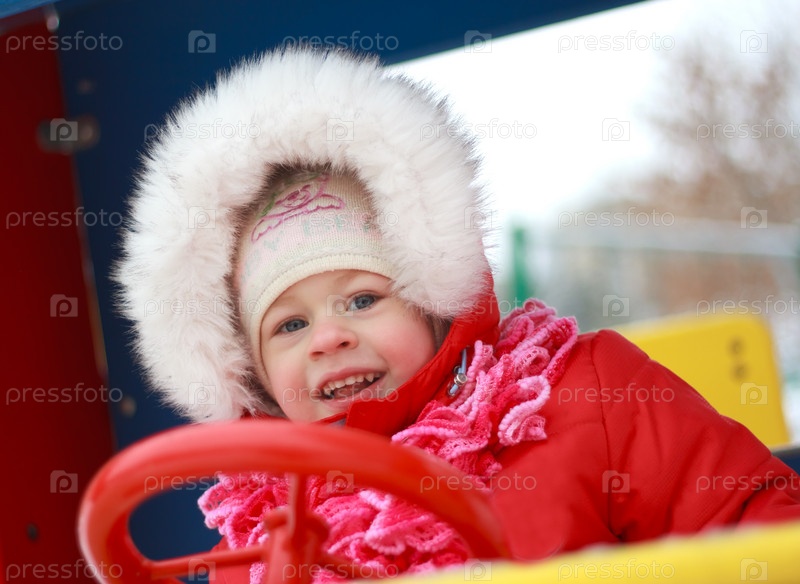 Красивый ребенок играет на снегу зимой