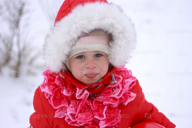 Красивый ребенок играет на снегу зимой