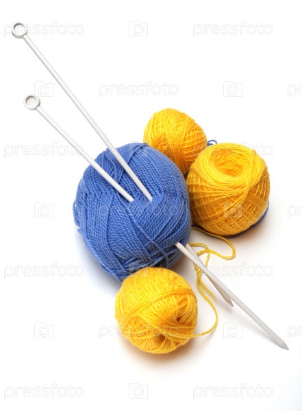 Пряжа и спицы на белом фоне