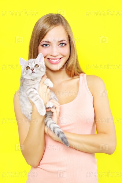 Улыбающаяся девушка с котенком породы шотландская короткошерстная