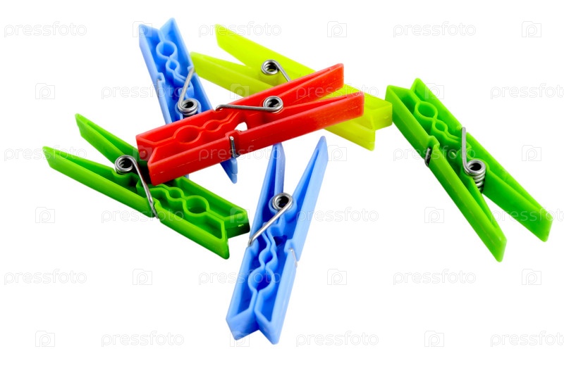 Группа цветных прищепок, изолированных на белом фоне