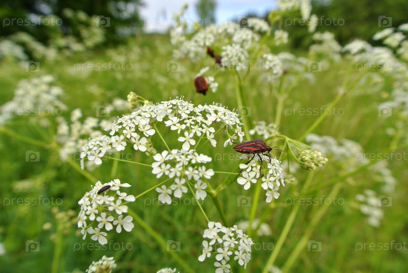 Красные жуки на луговых цветах