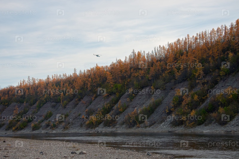 Вертолет летит над тайгой вечером