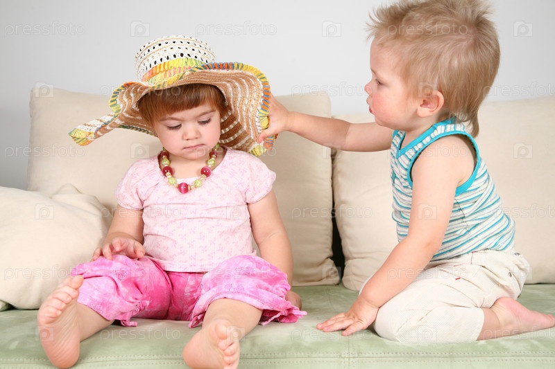 Два ребенка играют на диване