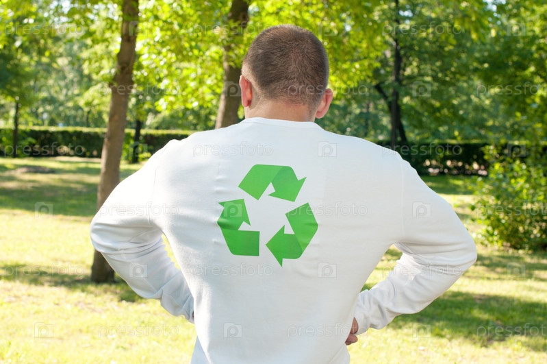 Стронгмэн со знаком переработки на футболке демонстрирует мышцы