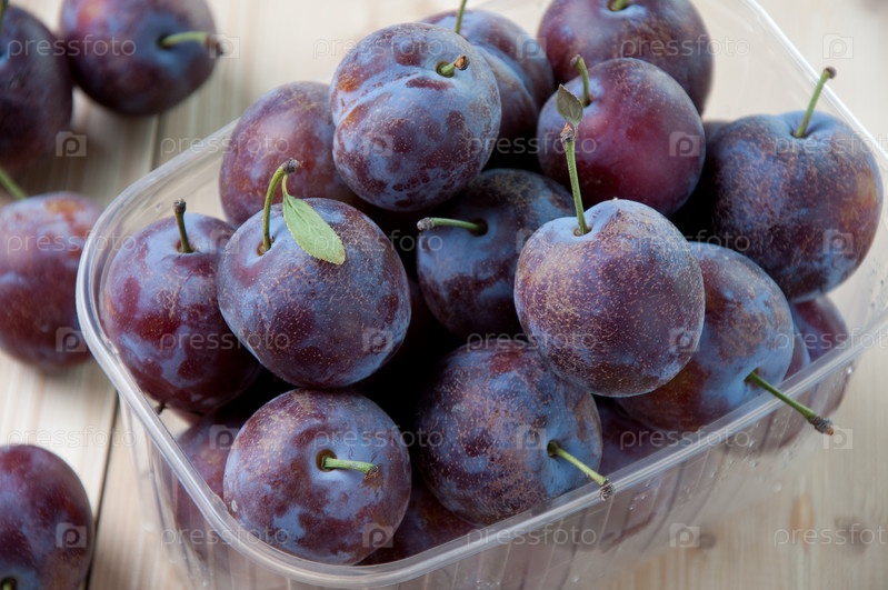 Пластиковый контейнер со спелыми сливами, вид сверху
