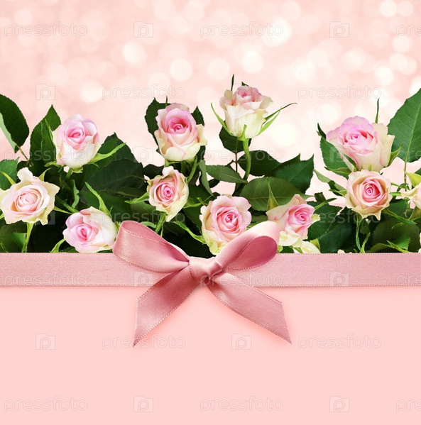 Розовый праздничный фон с шелковым бантом и розами