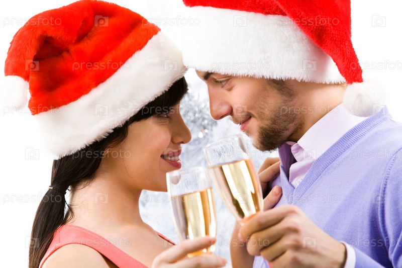 Портрет счастливой пары в шляпах Санты с шампанскими флейтами, смотрящих друг на друга