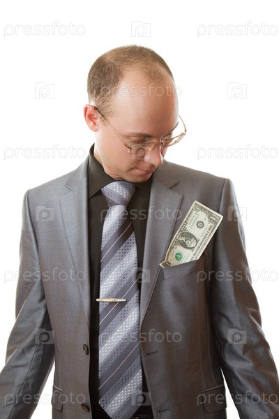 Бизнесмен в галстуке и очках с долларом в кармане на белом фоне