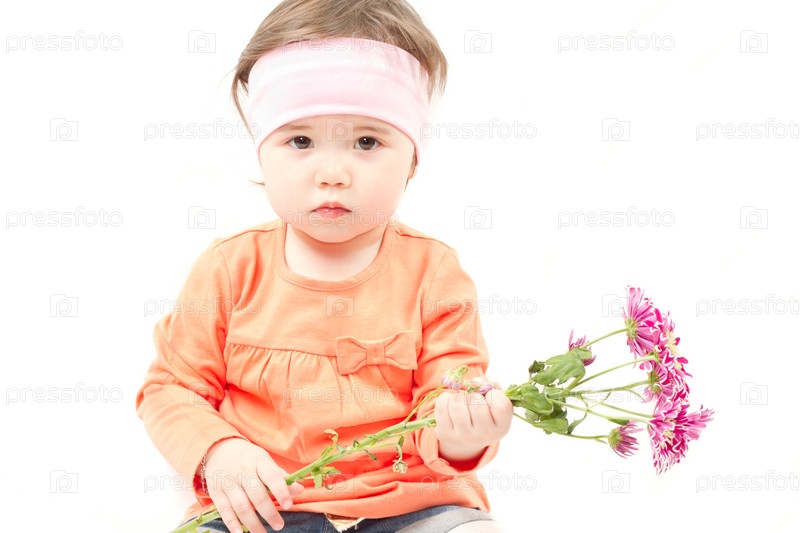 Милая маленькая девочка с цветами для матери на белом фоне
