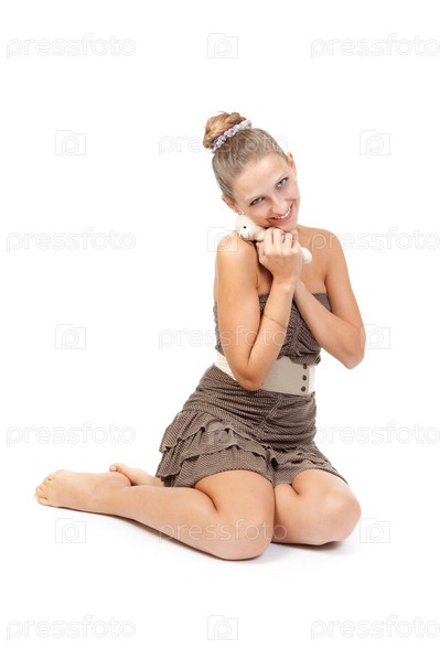 Красивая девушка с плюшевым мишкой сидит на полу
