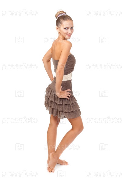 Портрет красивой молодой девушкой в бежевом платье с длинными босыми ногами