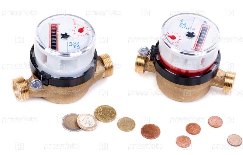 Концепция, символ сбережений, два водосчетчика и евро-центы