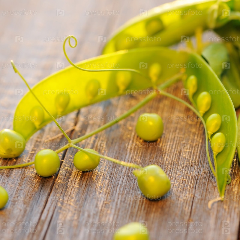 Стручки гороха на деревянном столе