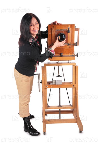 Женщина со старой камерой на белом фоне