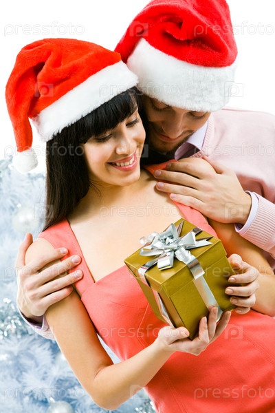 Портрет счастливой женщины, смотрящей на коробку с подарками в руках и обнимаемой любящим мужчиной
