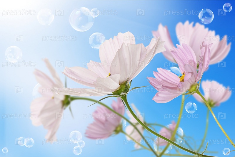 Розовые декоративные цветы на абстрактном голубом небесном фоне