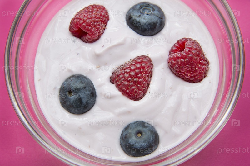 Тарелка с малиной и черникой в йогурте