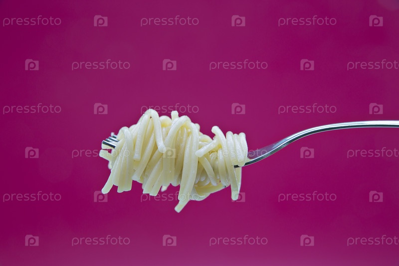 Лапша на вилке на красном фоне