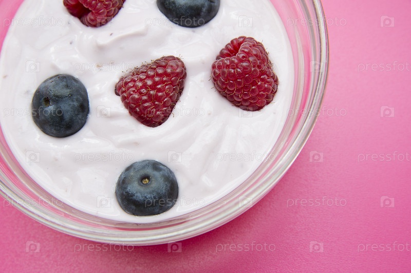 Тарелка с малиной и черникой в йогурте