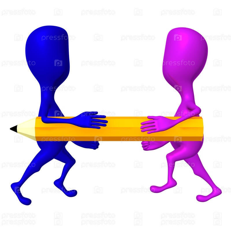 Две трехмерные куклы несут желтый карандаш