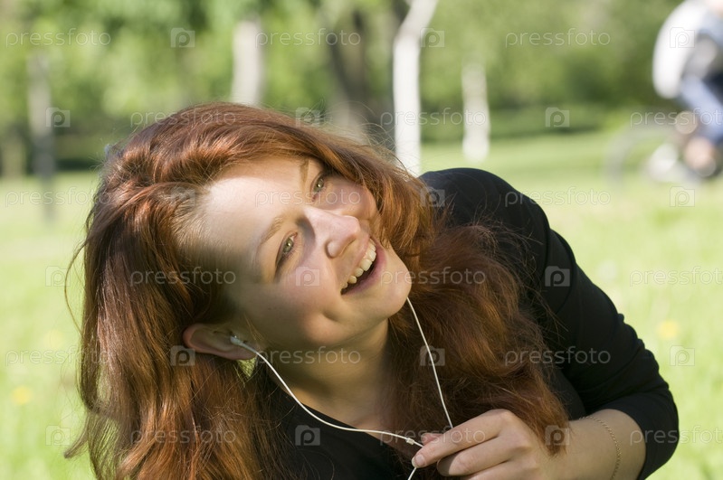 Рыжеволосая девушка наслаждается музыкой в парке