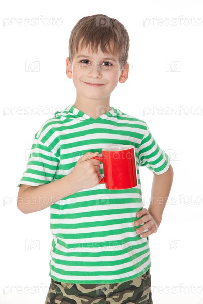 Мальчик держит красную чашку
