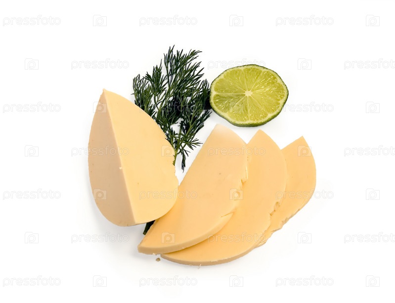 Сыр куском и ломтиками с укропом и кружочком лайма на белом фоне