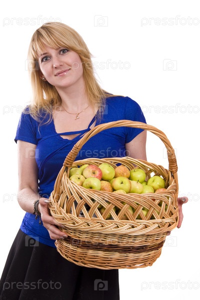 Женщина в синей блузке стоит и держит корзину, полную яблок на белом фоне