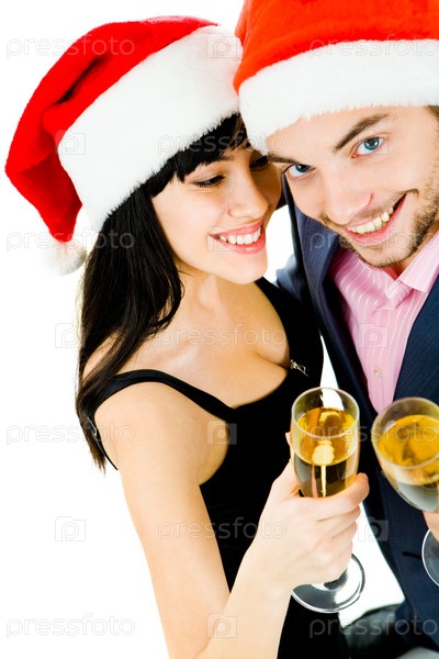 Портрет счастливой женщины с шампанской флейтой со своим мужем рядом