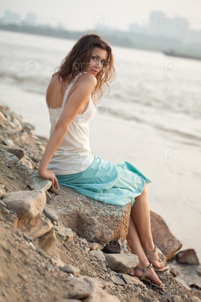 Молодая женщина сидит на камне