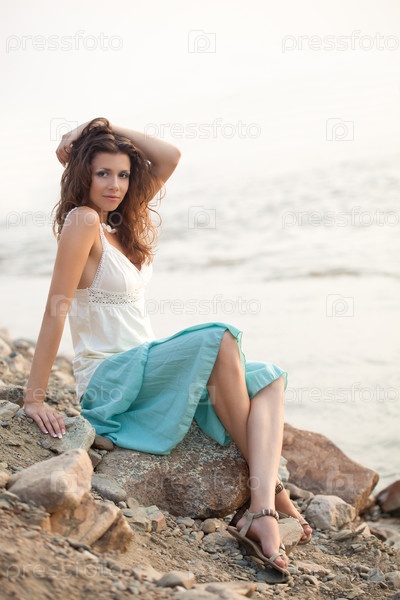 Улыбающаяся женщина сидит на камне