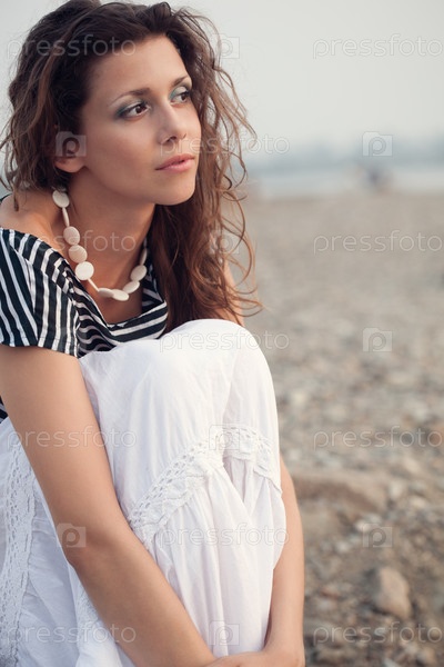 Великолепная женщина сидит на пляже