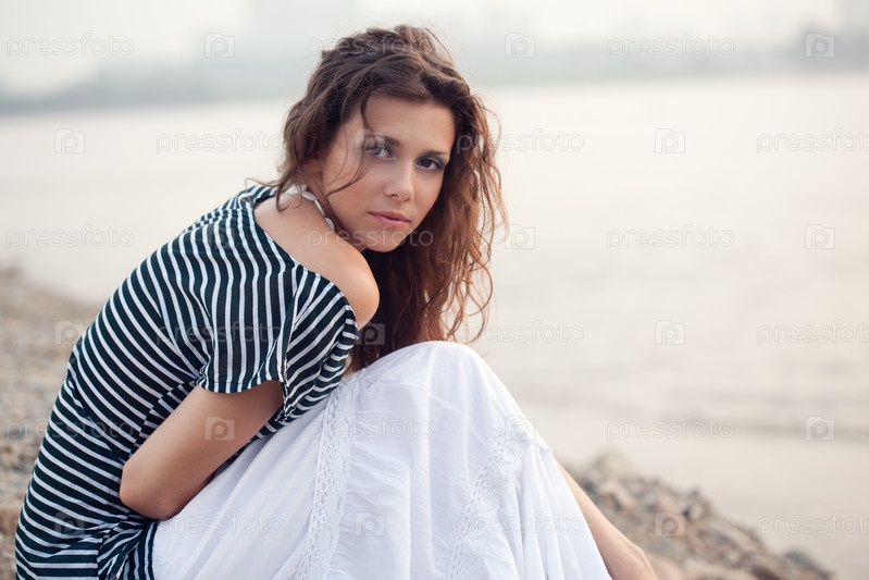 Великолепная женщина сидит на пляже