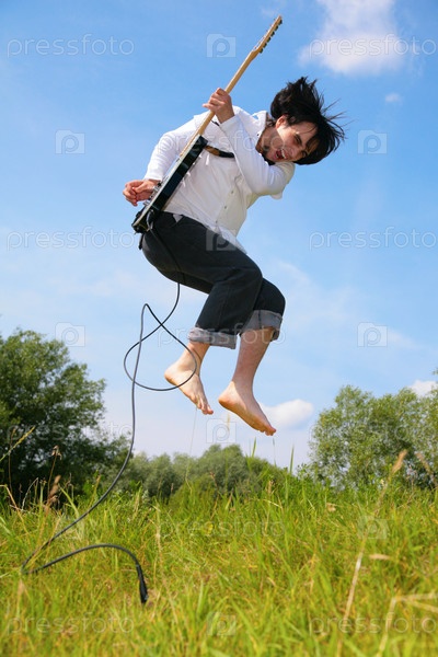 Красивая женщина прыгает с гиарой на траве