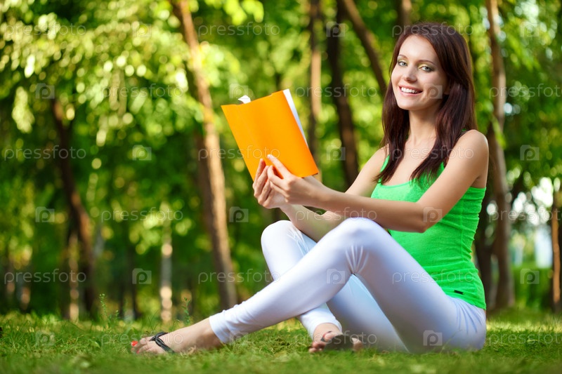 Женщина читает книгу в зеленом парке