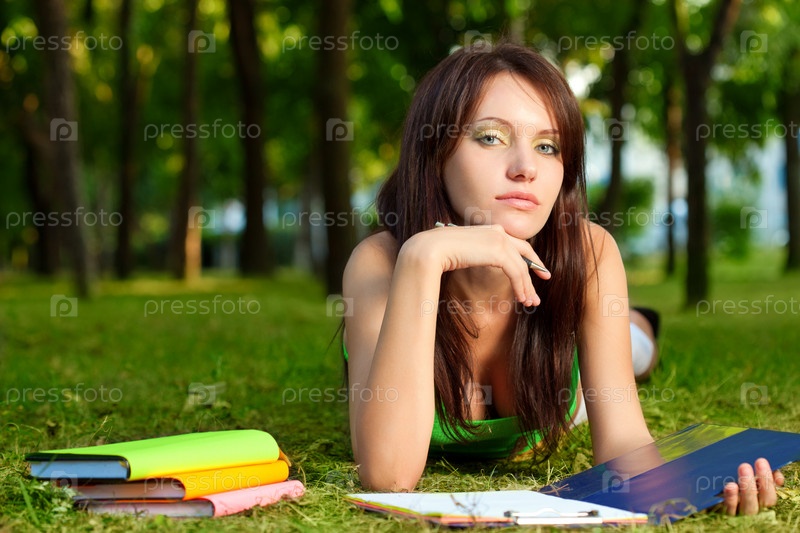 Женщина лежит на траве и смотрит в камеру