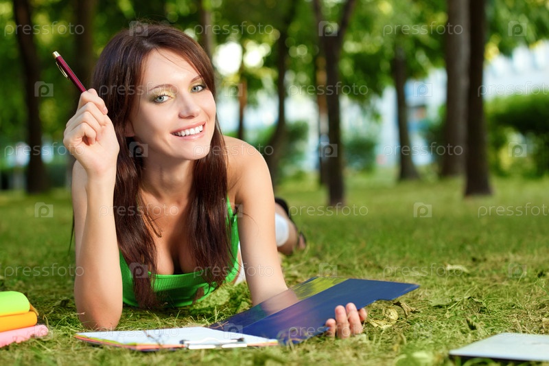 Студентка лежит на траве