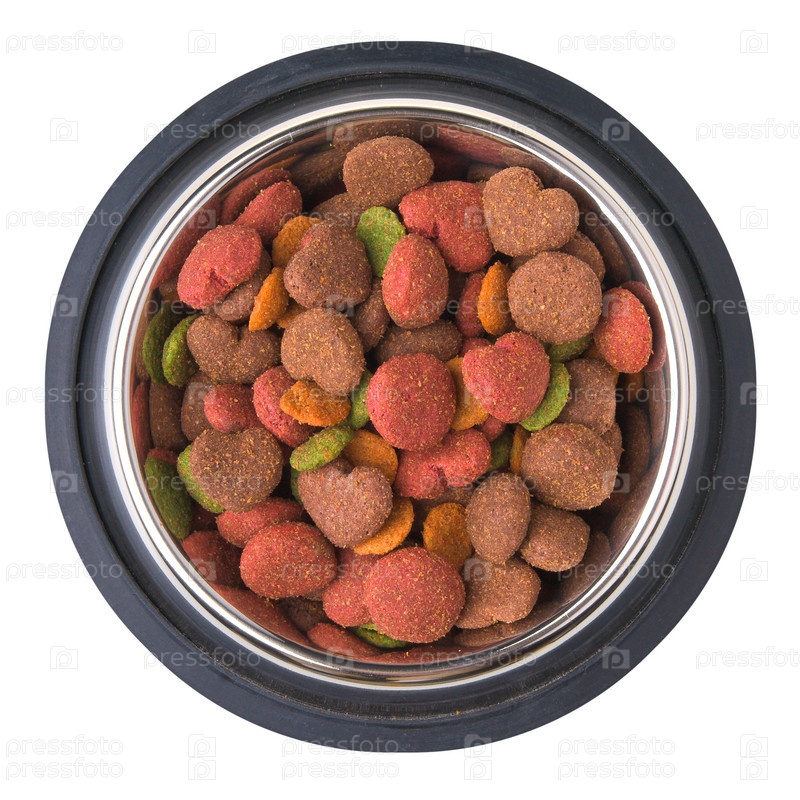 Сухой корм для собак в металлической миске