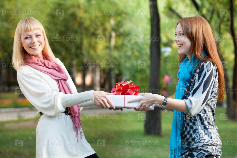 Две счастливые сестры с подарком в парке